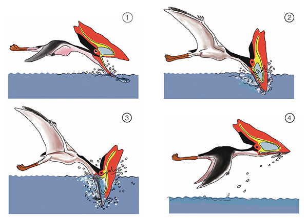 许多翼龙以鱼为食,它们长有锋利的牙齿,是技能高超的捕鱼能手。那些没牙的翼龙呢?它们同样可以像今天的海鸥一样捕食鱼类。这些翼龙会在掠过水面的时候,张开上下颌,在接触水面的一瞬间把头钻到水下,准确地咬住靠近水面活动的鱼类。人们在极少的翼龙标本的胃部发现了尚未消化完的鱼类骨骼,也在翼龙的粪便中发现鱼类骨骼碎片,这些是翼龙以鱼类为食的最直接证据。
